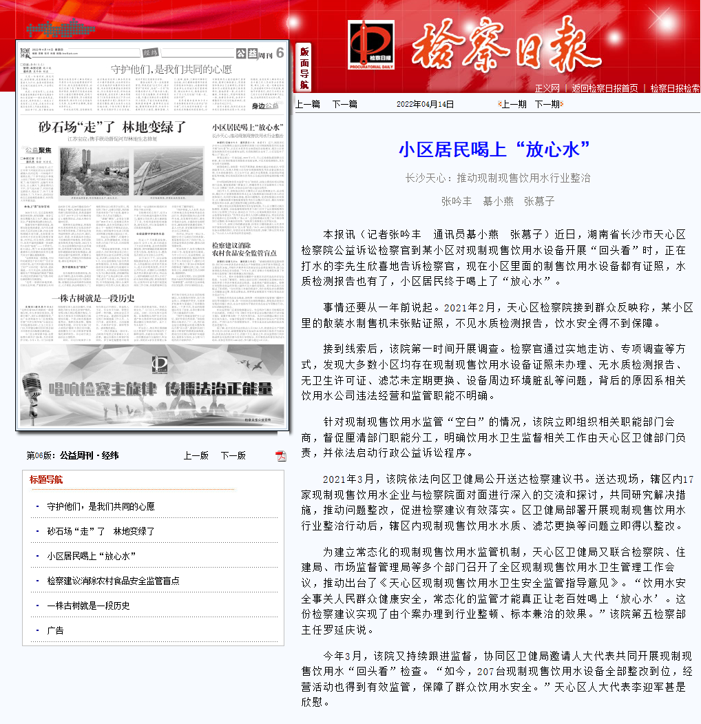 近日,湖南省长沙市天心区检察院公益诉讼检察官到某小区对现制现售饮用水设备开展“回头看”时,正在打水的李先生欣喜地告诉检察官,现在小区里面的制售饮用水设备都有证照,水质检测报告也有了,小区居民终于喝上了“放心水”。