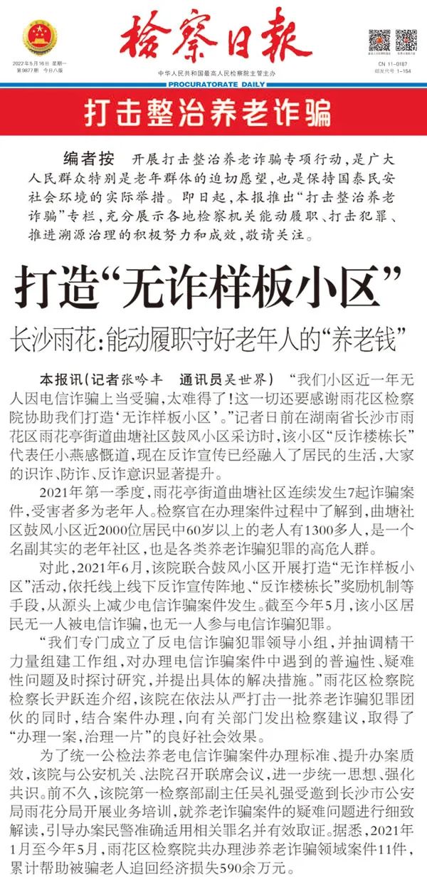 为贯彻中央部署,检察日报推出“打击整治养老诈骗”专栏,充分展示各地检察机关能动履职、打击犯罪、推进溯源治理的积极努力和成效,雨花区检察院《打造“无诈样板小区”》一文刊登于专栏第一篇。