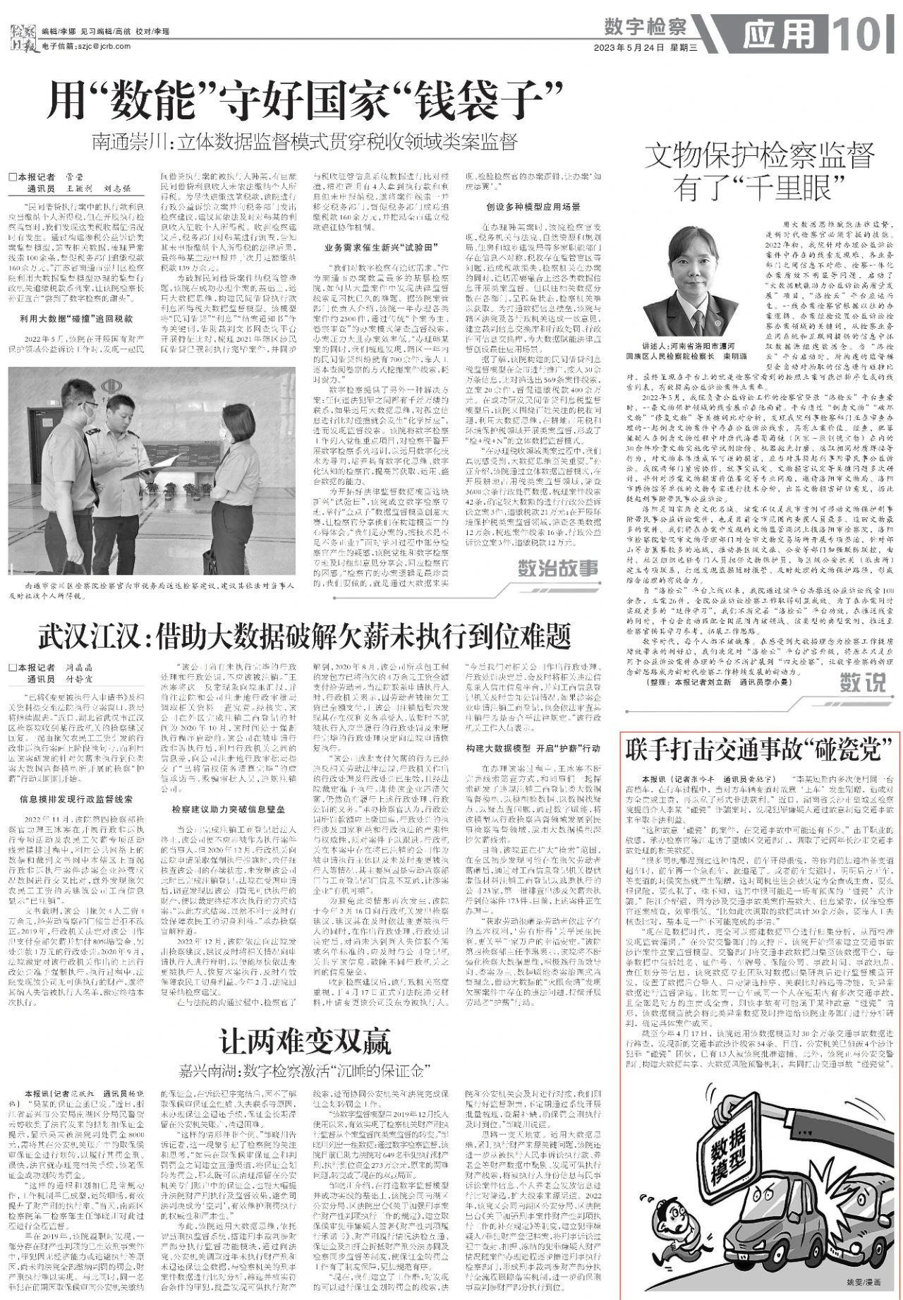 截至今年4月17日,该院运用该数据模型对30余万条交通事故数据进行筛查,发现新的交通事故涉诈线索54条。目前,公安机关已侦破4个涉诈犯罪“碰瓷”团伙,已有13人被该院批准逮捕。此外,该院正与公安交警部门构建大数据共享、大数据风险预警机制,共同打击交通事故“碰瓷党”。