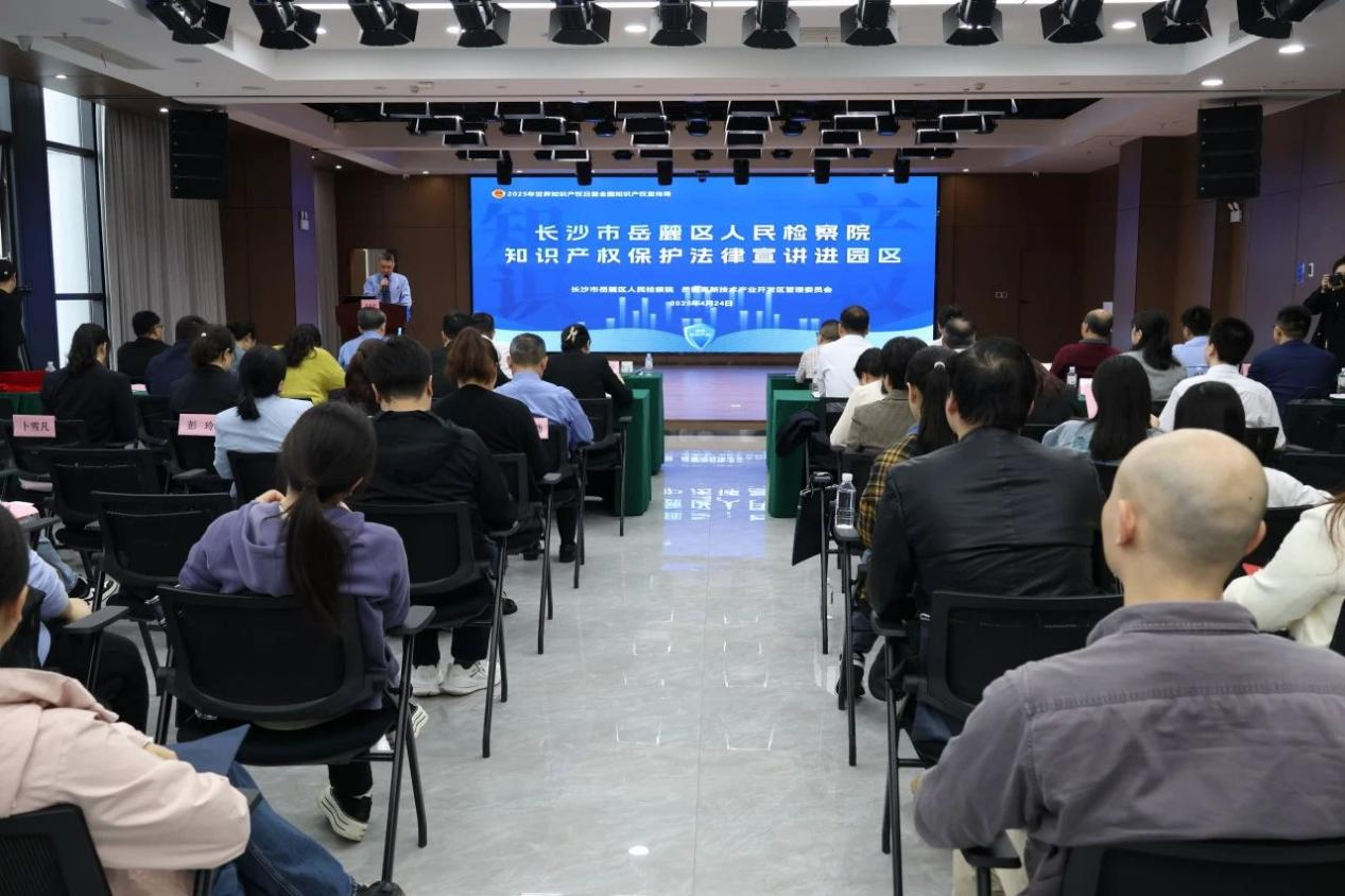 4月24日,全国知识产权宣传周期间,长沙市岳麓区人民检察院和岳麓高新技术产业开发区管委会共同开展“协同保护知识产权 依法助力创新发展”法律宣讲进园区主题活动。长沙市人民检察院、长沙知识产权保护中心、湘江新区政法工作部等单位代表,以及部分知识产权领域专家、企业代表等近百人参加活动。
