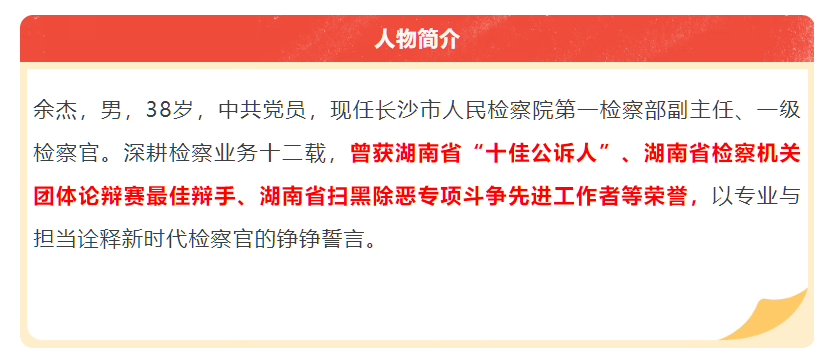 余杰用自己的专业、细致与担当,生动诠释了一名新时代检察官的“匠心”精神。他以法律为剑,惩恶扬善;以公义为盾,守护民心。在维护平安星城的道路上,步履不停,信念愈坚。