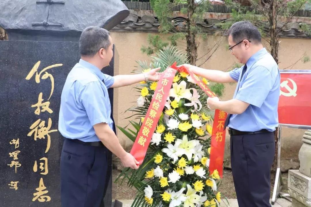 现场青年检察干警为何叔衡烈士敬献花篮、院领导为花篮整理缎带、鞠躬致敬、重温入党誓词。