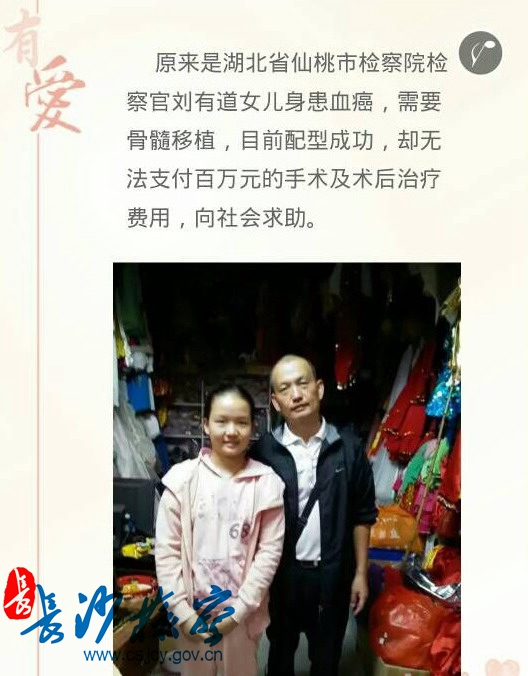 10月24日,星期六。在湖南省长沙县检察院的微信群中,出现了一条“救助小佳琪—— 湖北省仙桃市检察院检察官刘有道14岁女儿刘佳琪身患白血病,需要骨髓移植,目前配型成功,却无法支付百万元的手术及术后治疗费用,向社会求助”的信息,并附媒体报道链接。瞬间,群里炸开了锅,大家被这位优秀检察官和女儿与疾病抗争的事迹深深感动,纷纷希望能给予一份帮助,有的自发转账捐款,有的转发朋友圈呼吁……