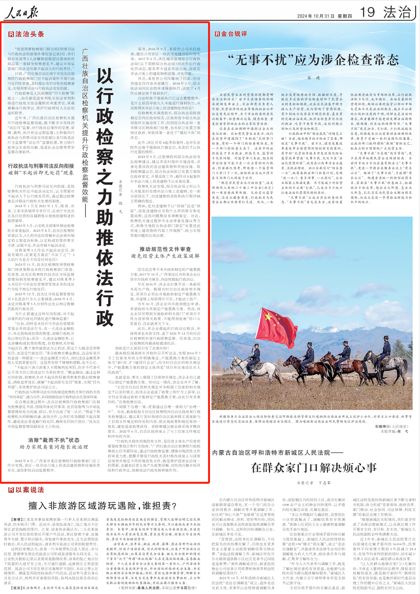“行政机关制发的规范性文件,是经营主体生产经营的重要政策指引和行为指南。”广西壮族自治区检察院行政检察部主任韦震玲说,通过行政检察监督,增强对规范性文件的审查力度,提醒并督促行政机关及时修改或废止与国家层面相关规定不符的规范性文件,既是维护国家法治统一的需要,也避免经营主体产生政策误解,对防范化解市场风险和行政争议,助推依法行政发挥积极作用。