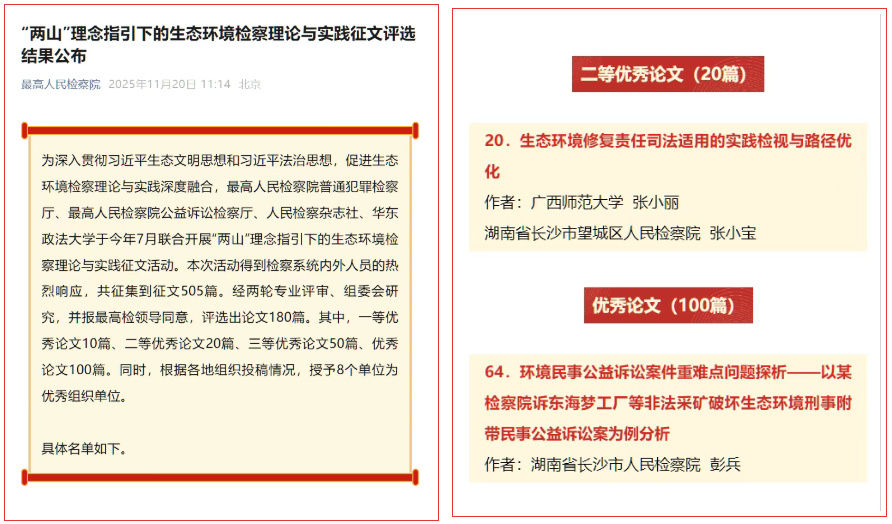 1120日,“两山”理念指引下的生态环境检察理论与实践征文获奖结果公布,长沙检察两篇论文分获全国二等奖和优秀奖。本次征文活动由最高人民检察院普通犯罪检察厅、最高人民检察院公益诉讼检察厅、人民检察杂志社、华东政法大学联合开展,共征集到论文505篇,经两轮专业评审、组委会研究,并报最高检领导同意,评选出论文180篇,其中,一等优秀论文10篇、二等优秀论文20篇、三等优秀论文50篇、优秀论文100篇。